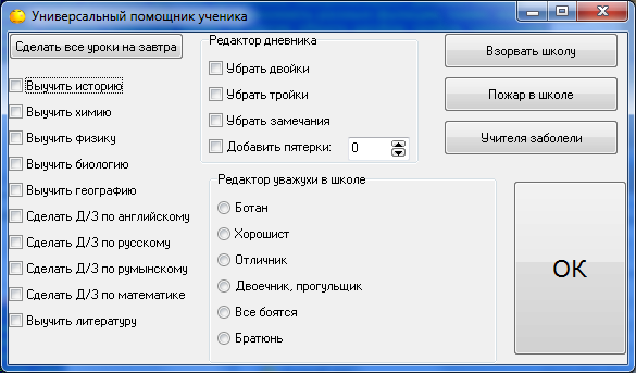 Супер-новинка для школьников! Надоело выполнять кучу домашки? Вам поможет Универсальный помощник ученика! Данная программа синхронизирует данные между дневником ученика и собой, после чего можно выполнять разные функции, такие, как сделать все уроки на завтра, сделать отдельно какие-то уроки, убрать двойки, тройки, замечания, добавить пятерки, редактировать своё уважение в школе, взорвать школу, сделать пожар либо создать заражение гриппом для учителей. От Skgaming.Ru